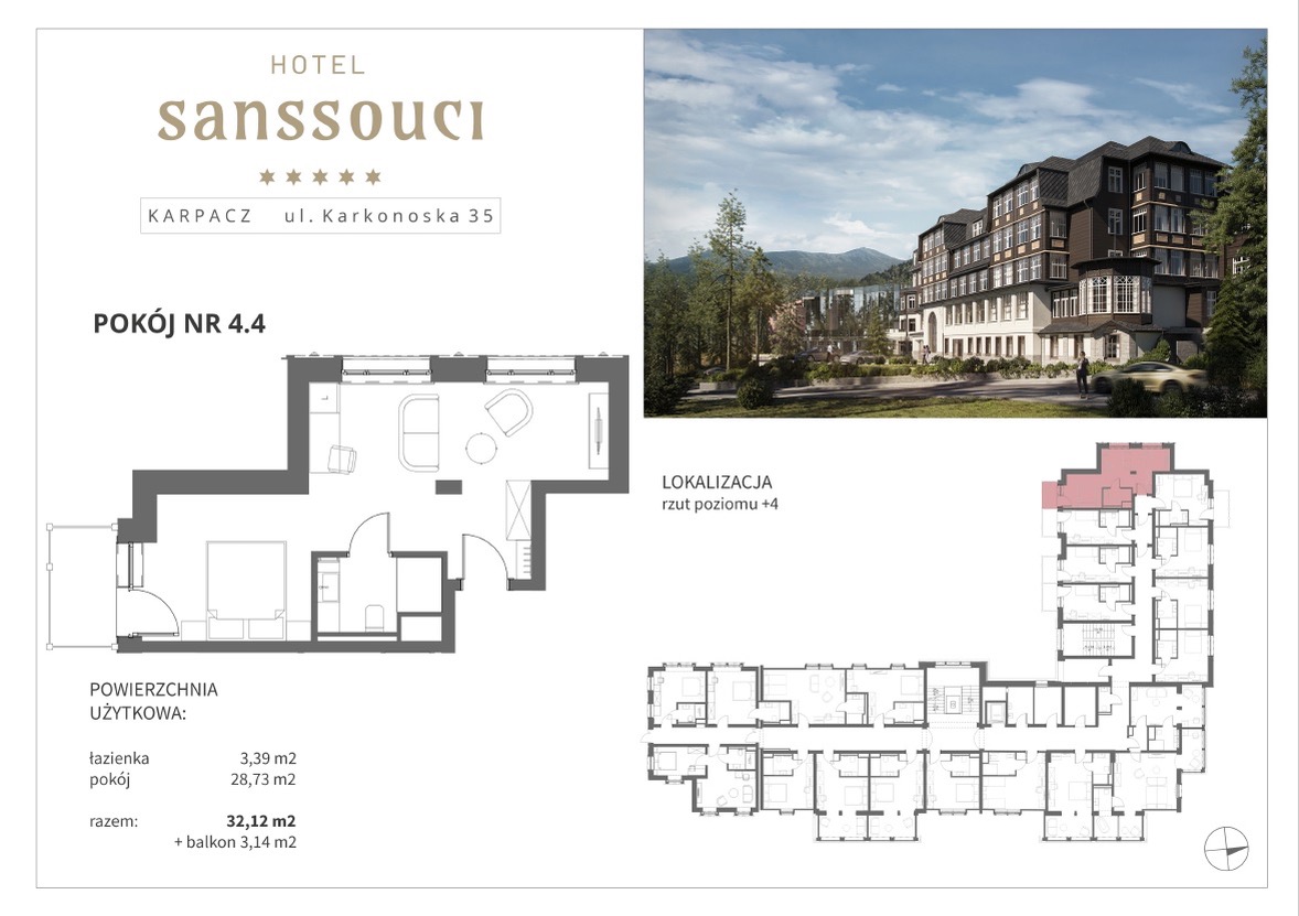 Bei dem angebotenen Objekt handelt es sich um ein hochwertig konzipiertes Hotelapartment im bekannten Hotel Sanssouci in Karpacz (ul. Karkonoska 35) – einer der gefragtesten Ferien- und Erholungsdestinationen im polnischen Riesengebirge. Das Apartment befindet sich auf Ebene +4 und ist Teil eines architektonisch ansprechenden Hotelensembles, das sich durch seinen gehobenen Charakter, eine klare Formsprache sowie ein stimmiges Gesamtkonzept auszeichnet.